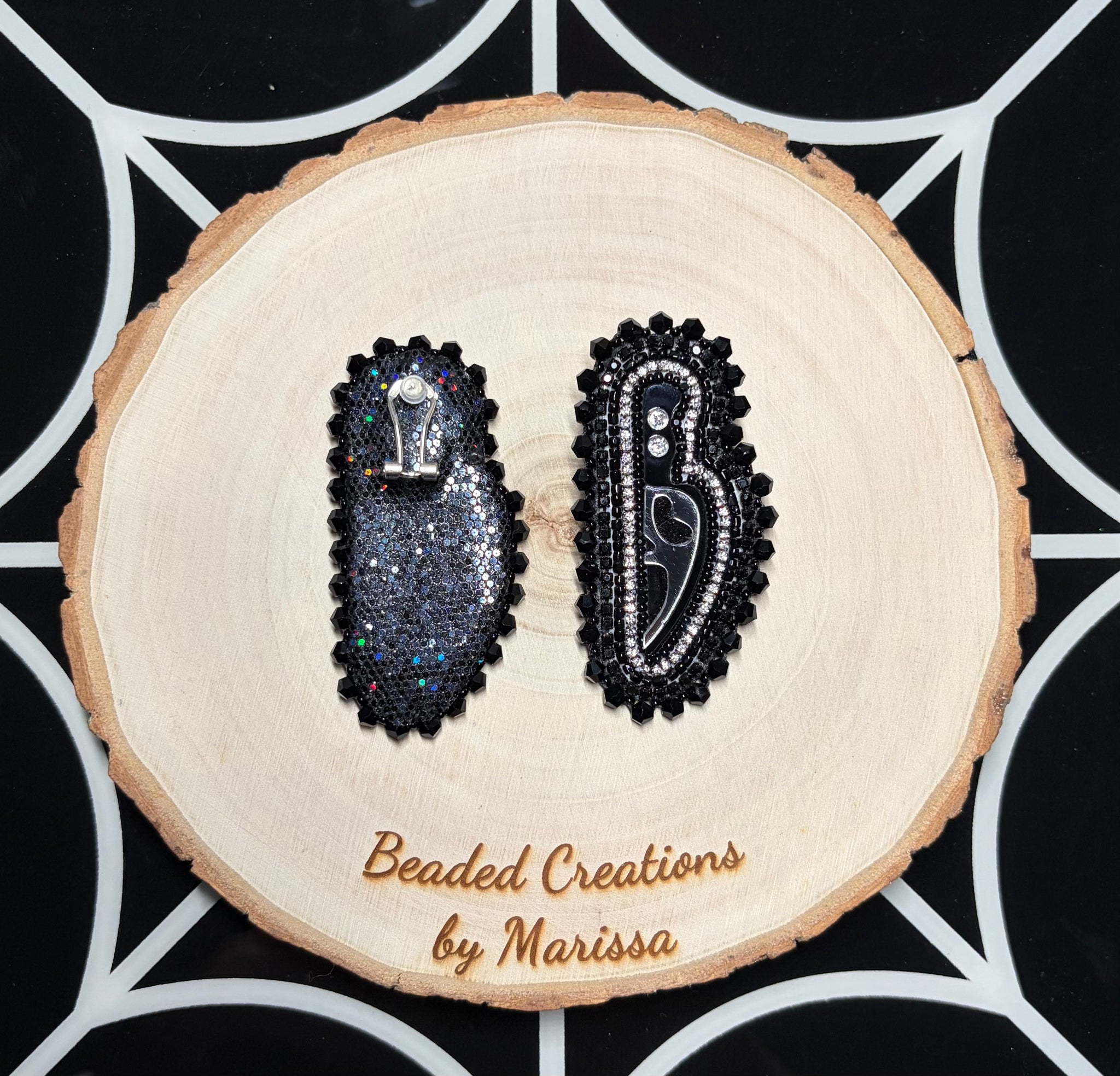 Gho0stface mirror knife earrings, edged with glass bicone beads on leverback posts.