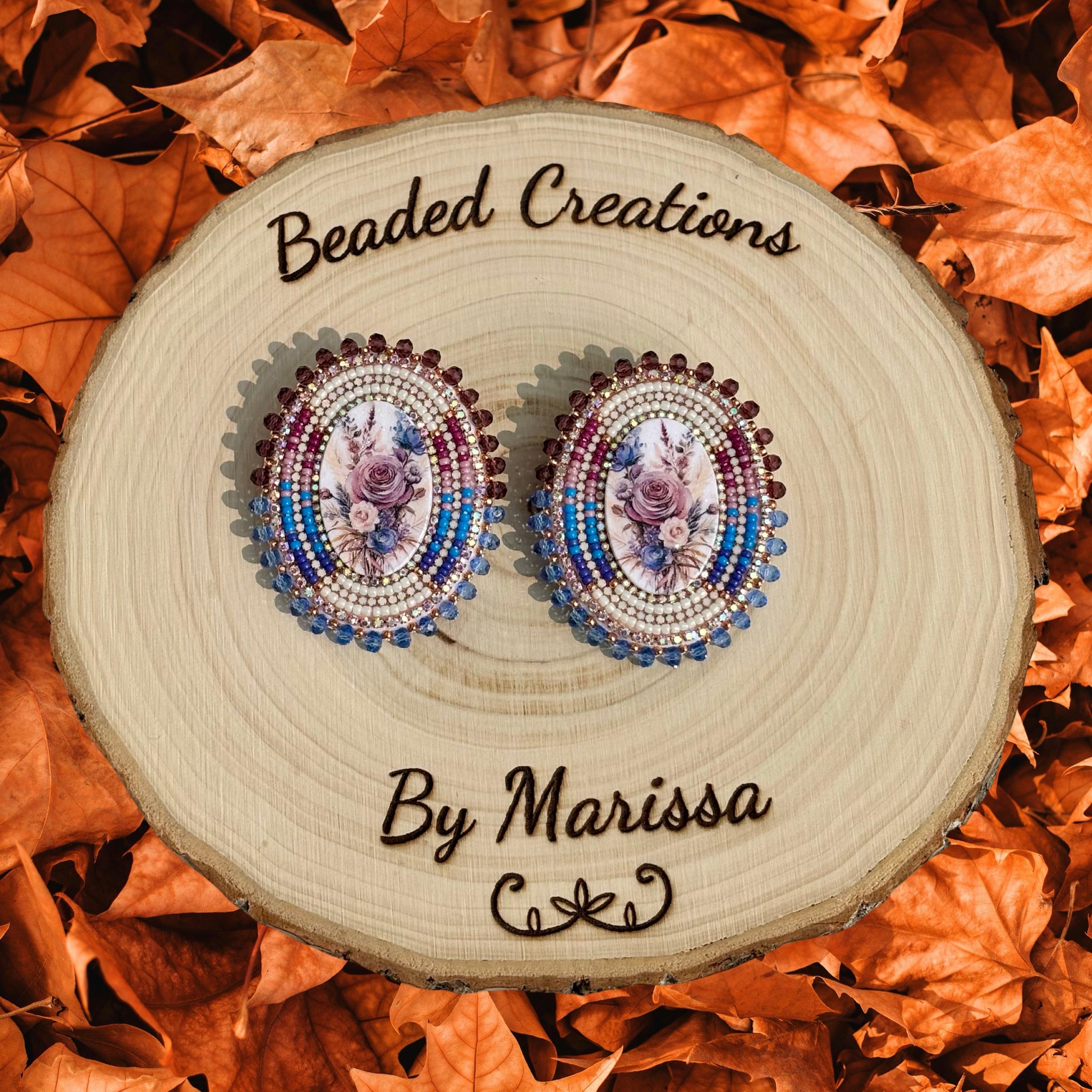 Mauve and blue wooden floral cab earrings, edged with glass rondelles on leverback posts