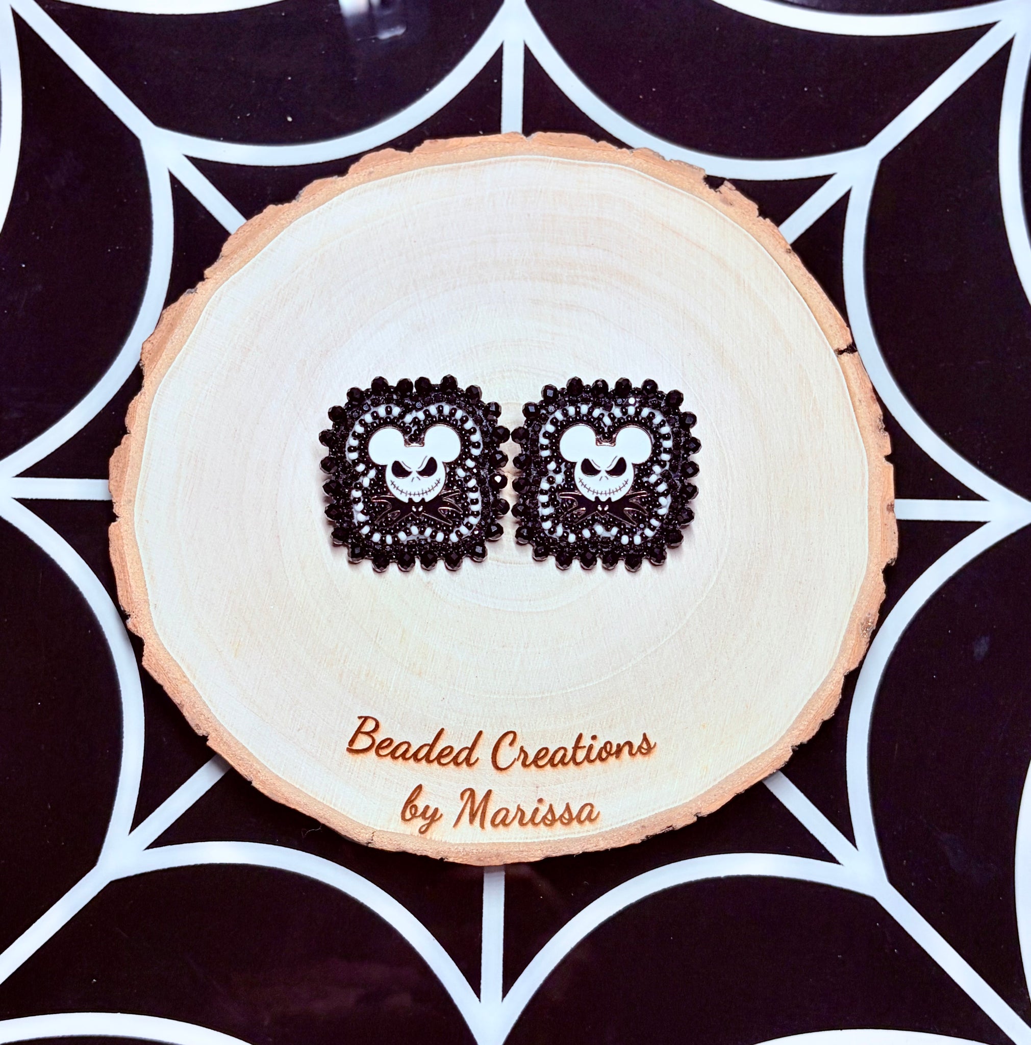 Mickey Jack Skellington earrings, edged with glass rondelles on regular posts
