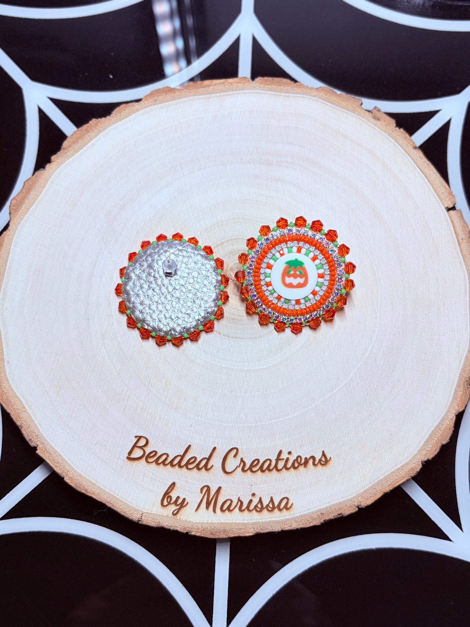 Pumpkin sugar cookie earrings, edged with precosia bicone beads on regular posts.